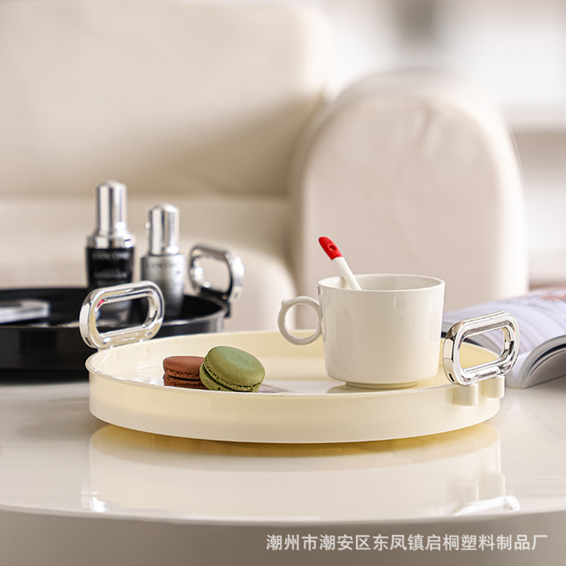 北欧の軽い豪華なトレーの丸いプラスチックのアクセサリーの収納の皿の丸い家庭用の高級なお茶の杯のお菓子の果物は皿を並べます。