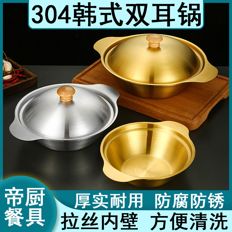 304 韓国鍋両耳平底蓋付き小型乾鍋ゴールデンステンレス鋼シーフードライス鍋フライドチキンプレート麺鍋