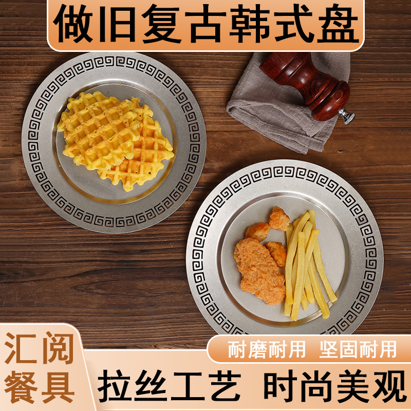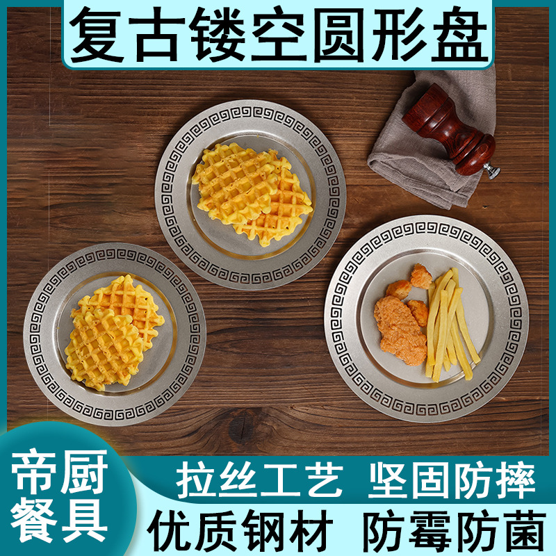 古いレトロなプレートクリエイティブ和風洋食プレートステーキプレートカフェケーキプレートエンボスステンレス鋼ラウンドプレート