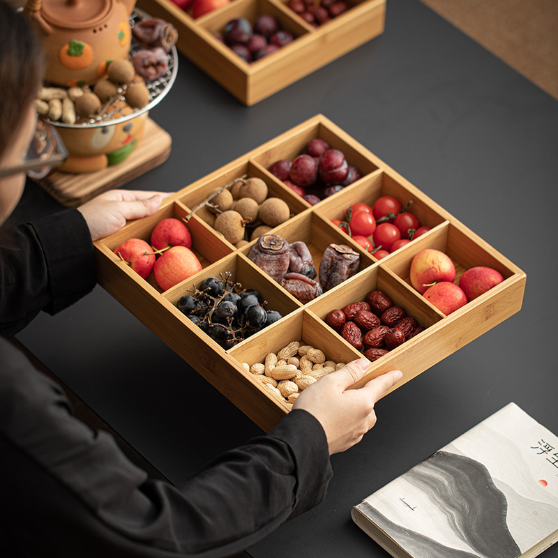 竹の木の九宮の格の盛り合わせの鍋の焼肉の付け合わせのトレーの囲炉裏はお茶の果物の皿の家庭の創意のお菓子の小食の皿を煮ます