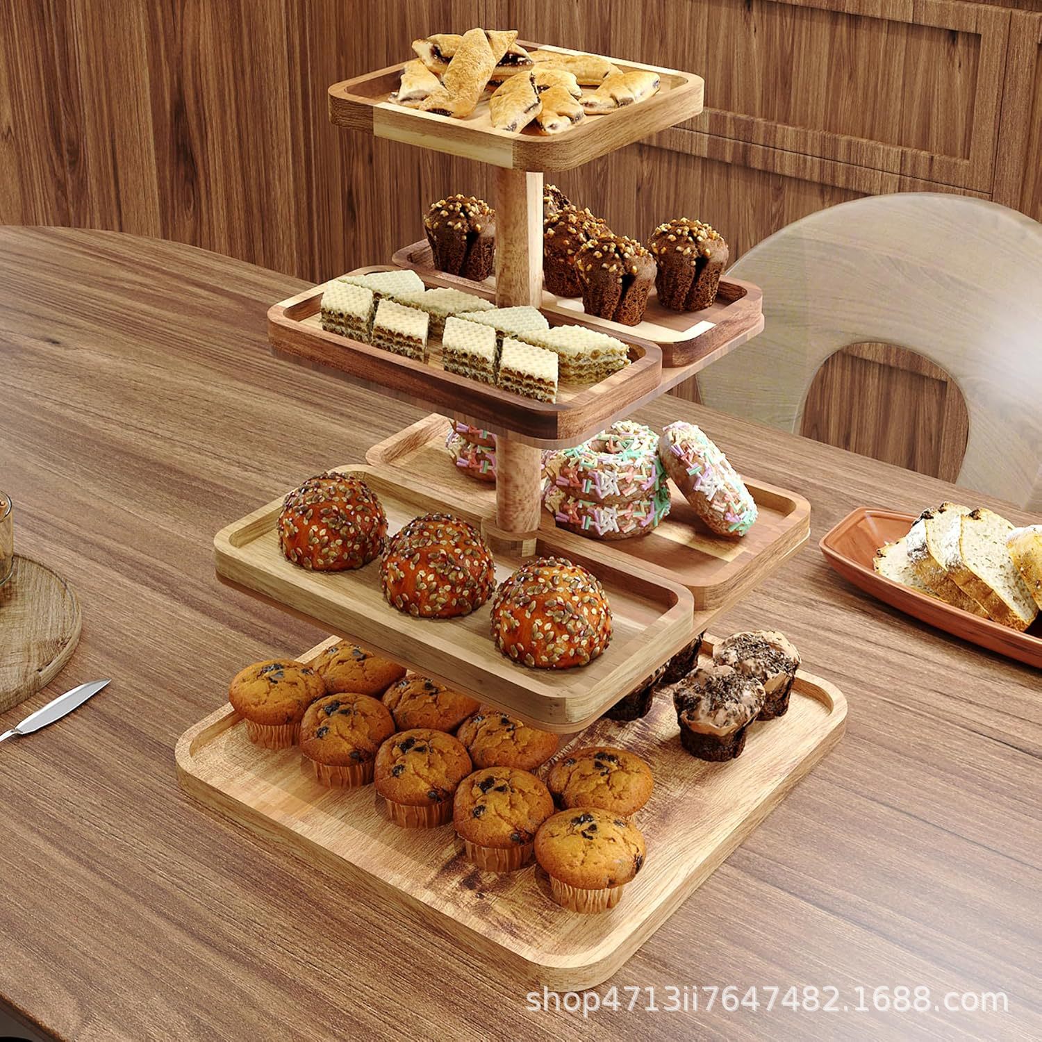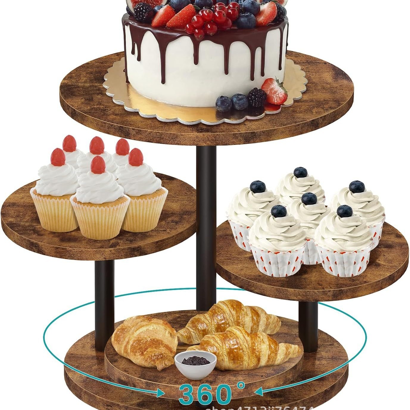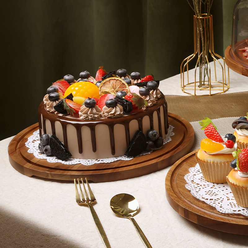 無垢材ラウンドケーキトレイダイニングテーブル回転可能なデザートペストリー木製トレイ結婚式のテーブルトップケーキディスプレイスタンド