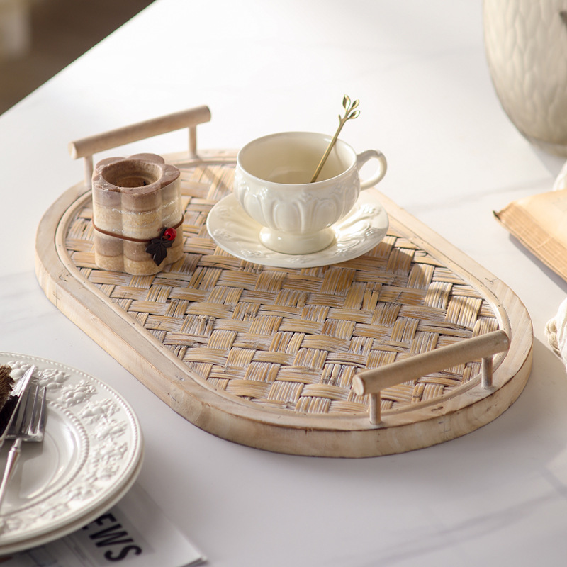 新しい中国風の木製竹織りクラフトトレイセット B&B ホテル装飾フルーツプレートレストランリビングルーム収納トレイ
