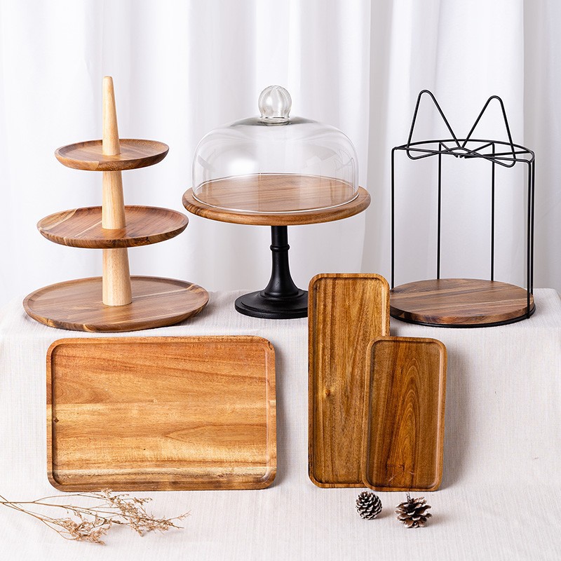 デザート台置物結婚式誕生日飾り道具銅取っ手アカシア木パレットケーキ皿お菓子展示棚