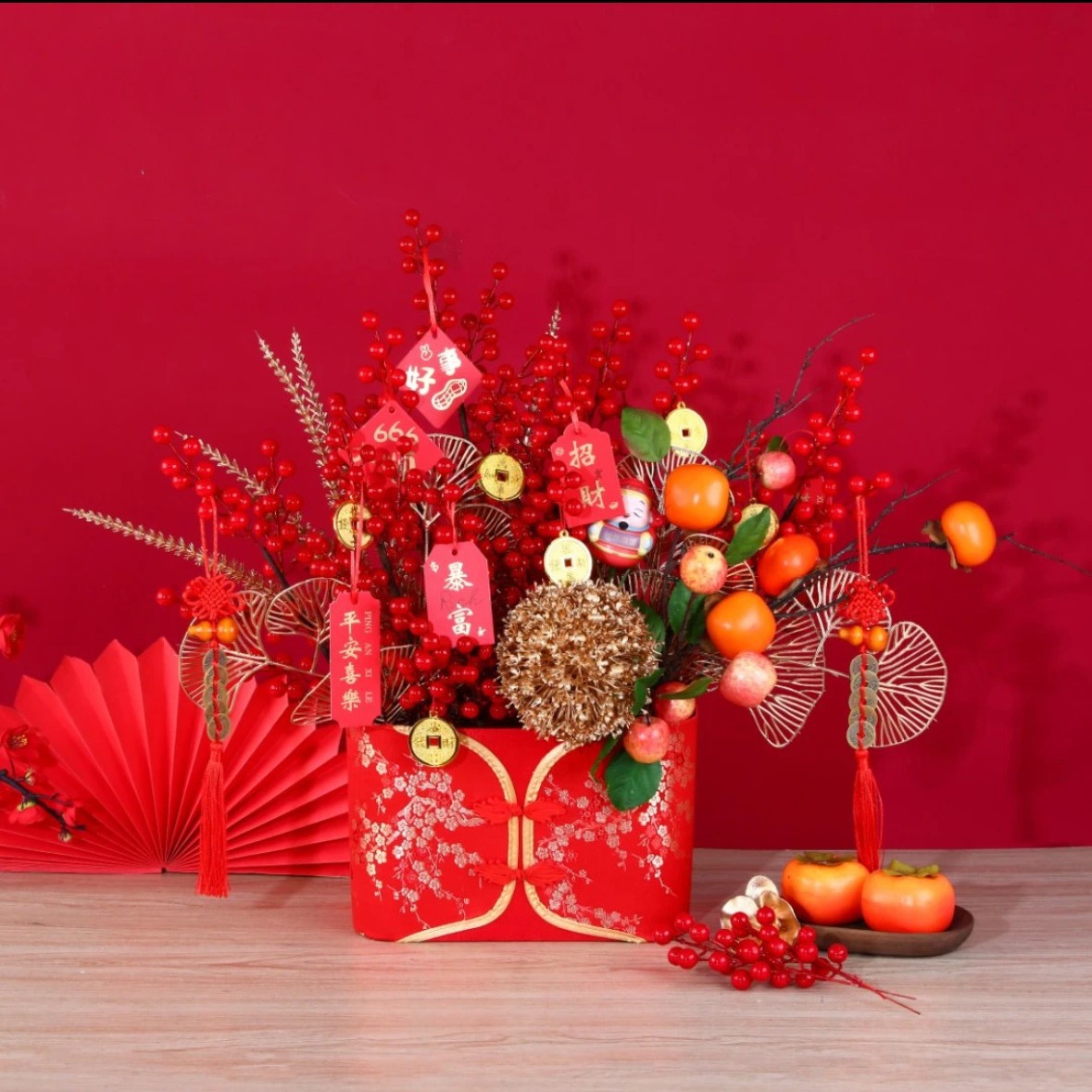 新年の赤い祝福のバケツ、金メッキの絵、春節の収納包装、ハグバケツ、新築祝いのフラワーアレンジメント、祝福のバケツの結び目