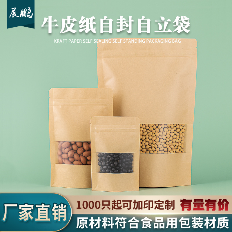窓開けクラフト紙袋厚手自立自封袋現物茶葉袋卸売り食品包装ビニール袋ロゴ