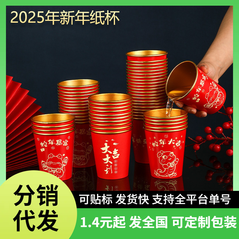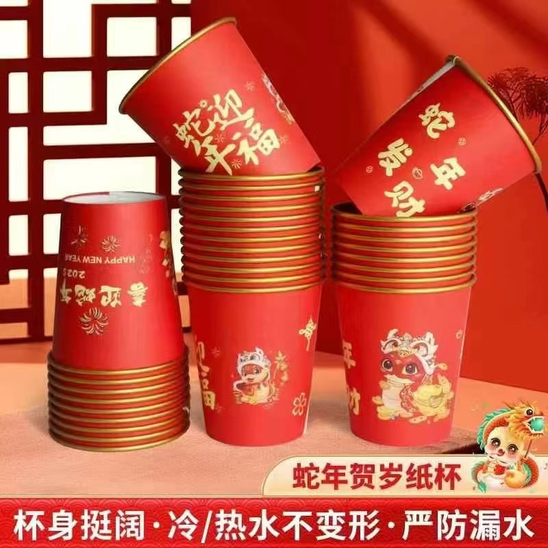蛇年紙コップ2025新年紙コップ使い捨て家庭用金箔紙コップ厚い赤いお祝い紙コップ卸売り
