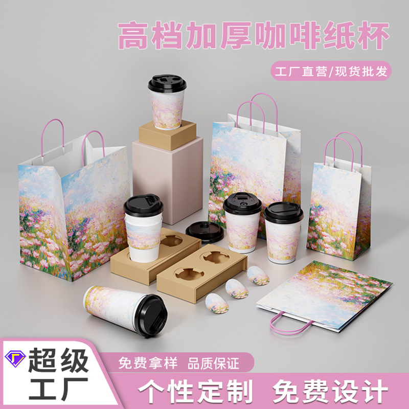 油絵ジャスミンミルクカップ使い捨てコーヒーカップ厚さ二重冷熱通用紙コップ蓋付き商用包装カップ