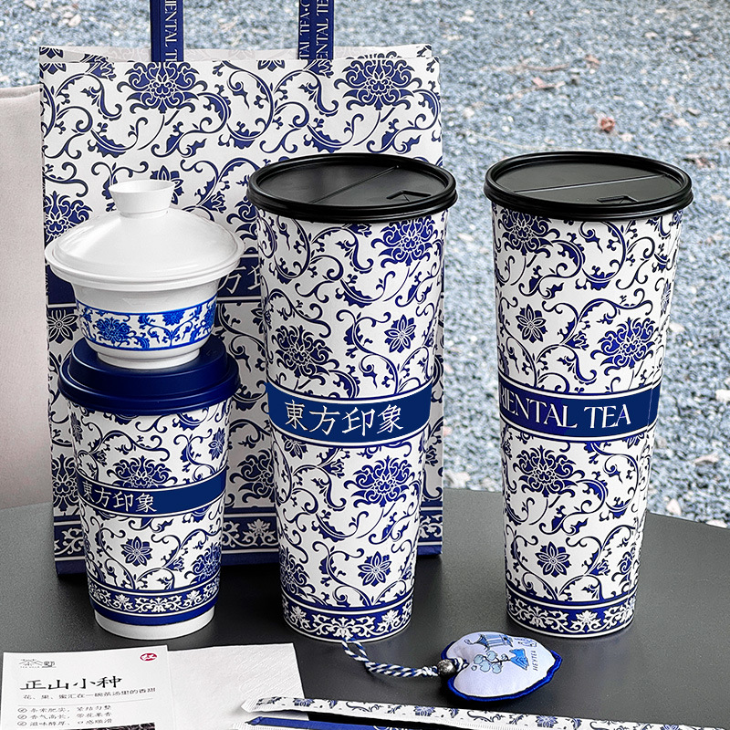 大きな使い捨てミルクティーカップ、二重構造カップ、ネットで話題の青花柄、中国風新茶飲料用紙コップ、ロゴ印刷可能