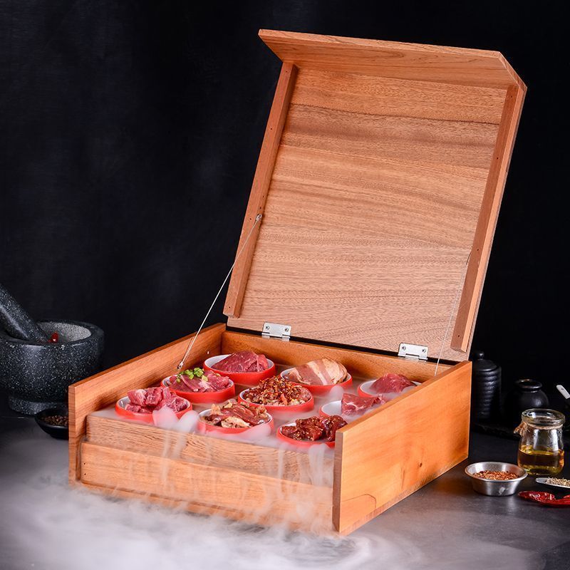 韓国式焼肉店のドライアイスは蓋付きで煙が出ます。