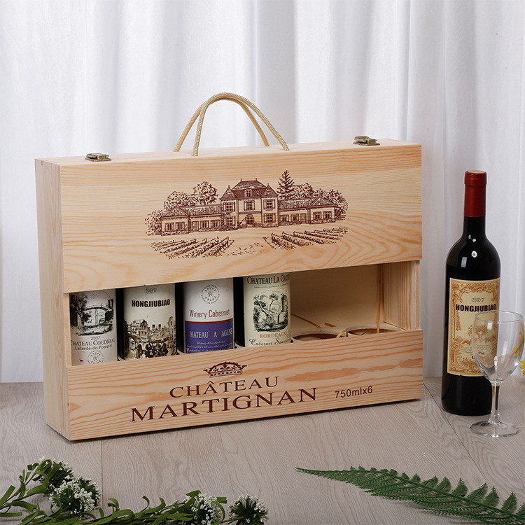 松の木の酒の箱の木の箱の6本の透かし彫りの創意のワインの収納箱のワインの白酒の外包装の贈り物の箱の卸売り