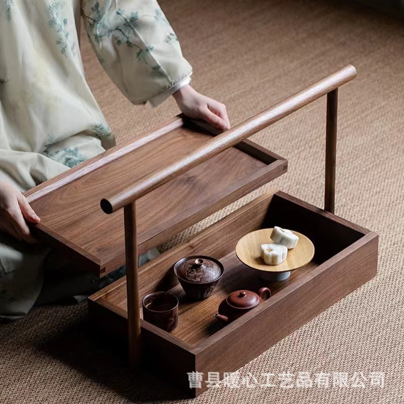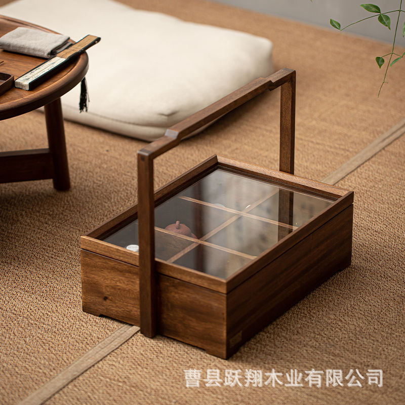 実木収納ケース黒胡桃手提げギフトボックス中国式レトロ宋風茶室菓子箱収納ケース手提げ木箱