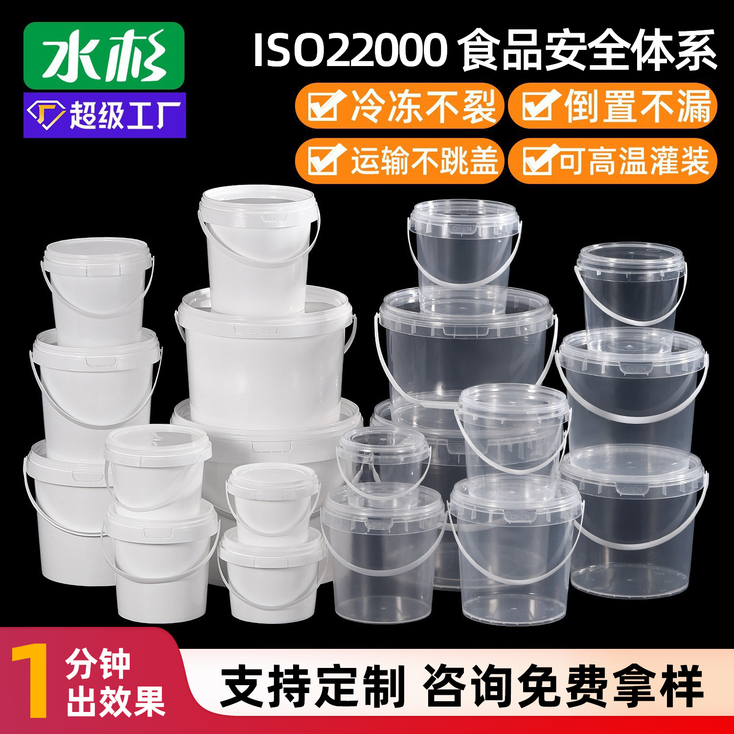 食品グレード透明ミルクティーPPプラスチックバケツ 密閉丸型スナックバケツ 1L5L 白色蓋付き水桶 収納バケツ