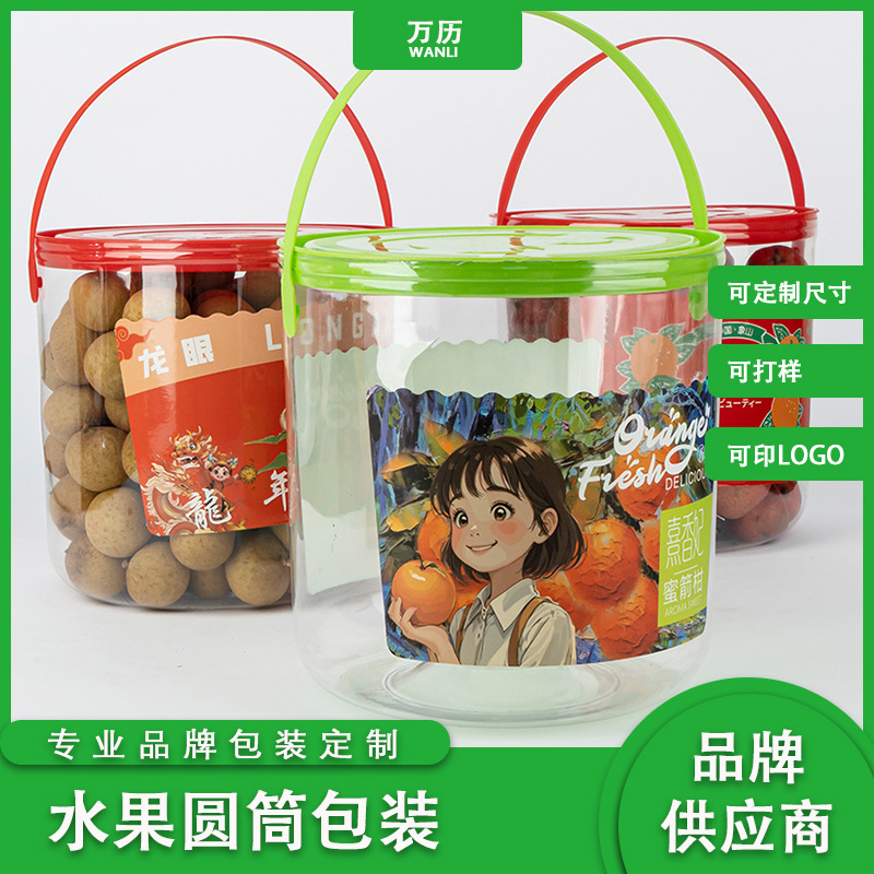カスタマイズされたプラスチックフルーツハグバケツ、透明な小さなリンゴの丸いポータブルバケツ、ラベルを貼り付けることができるフルーツ包装バケツの生産