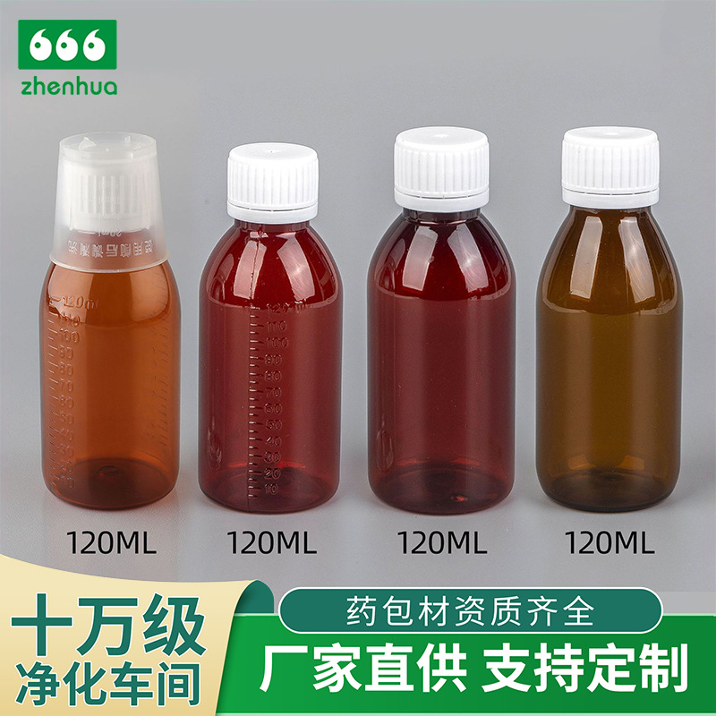 メーカー直供120MLPET経口液体茶色薬用ポリエステルボトル防犯カバー計量カップ薬用シロップボトル
