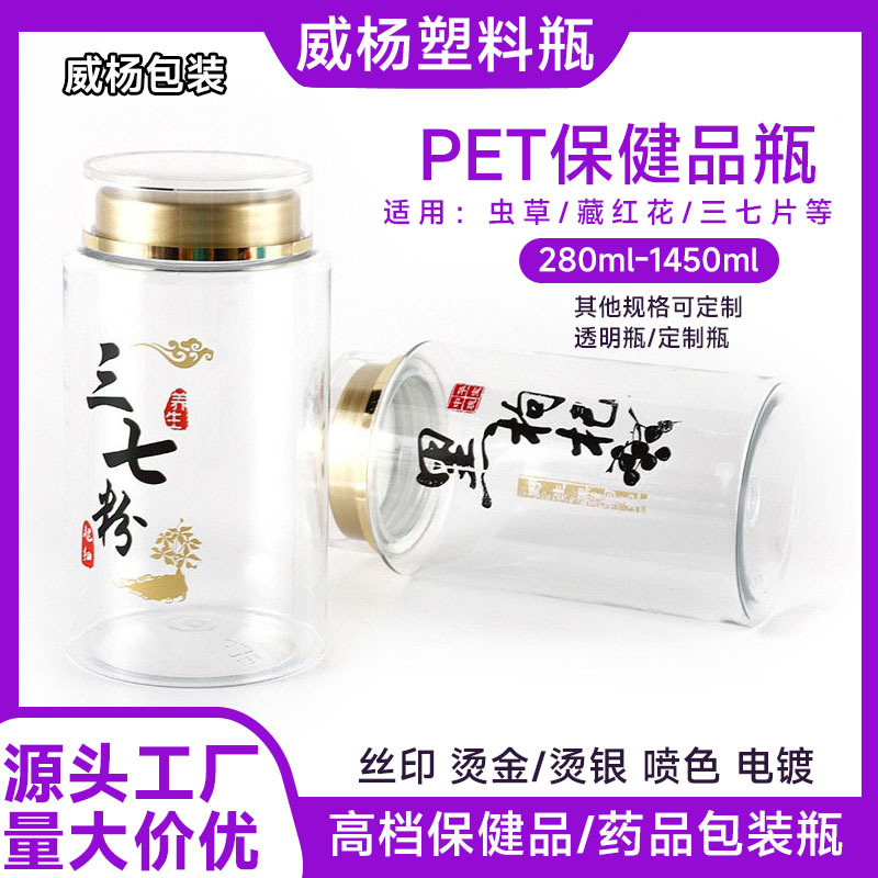 ペット用二重蓋高級健康食品ボトル、クコ、石斛、霊芝、三七人参入りプラスチックボトル、密封ボトル、透明ボトル