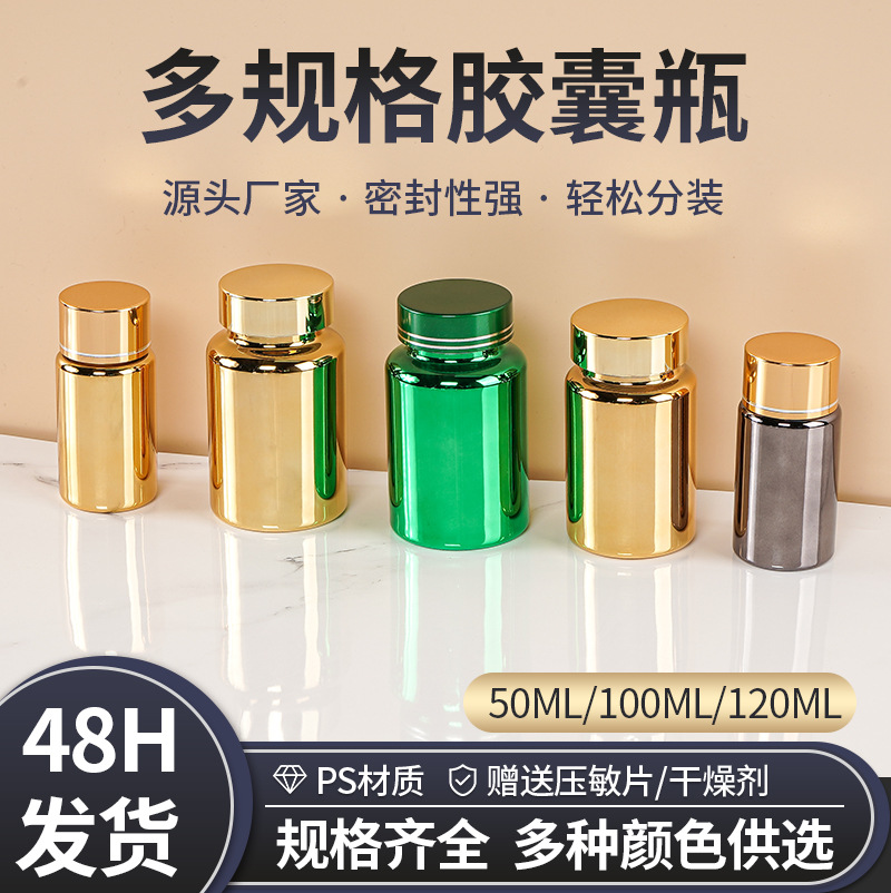 高級な金色のカプセルの瓶の保健品の瓶の電気めっきのアクリルは光を避けて薬の瓶の薬の粒を包装して空の瓶を分けます。