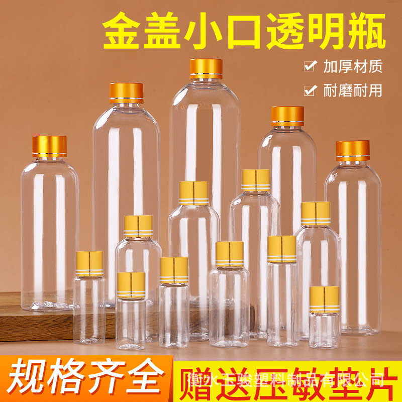 ポータブル透明ゴールドキャップボトル 30 50 100 ミリリットルサンプルボトルプラスチックボトルゴールデンビーンズ保存ボトル