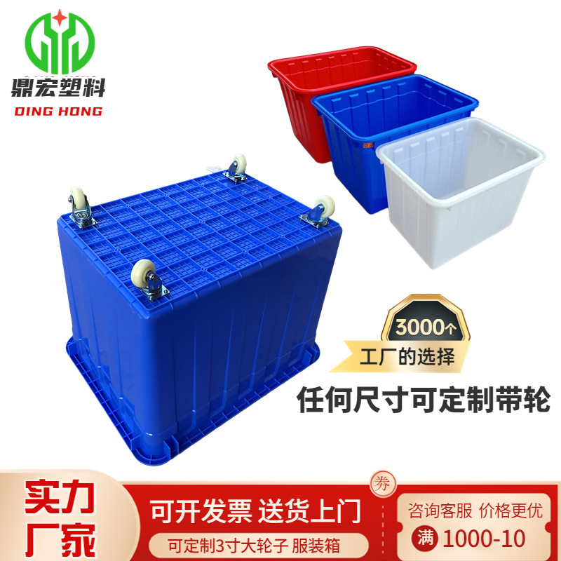 厚手のプラスチック製キャスター付き回転箱、衣料品工場用大型プラスチック箱、長方形の回転バスケット、プラスチック製水槽