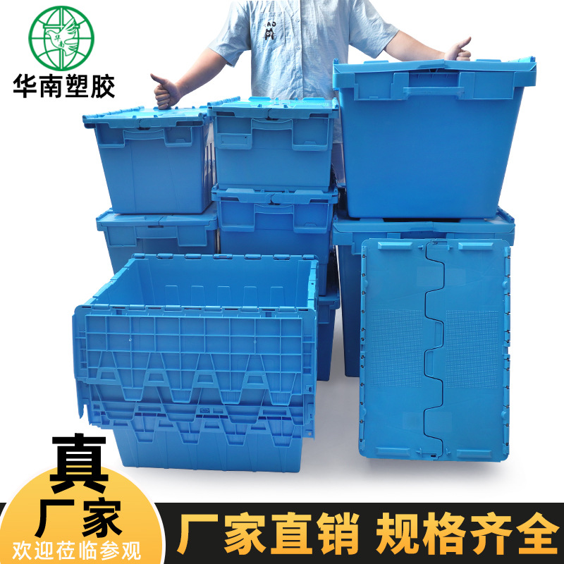 厚い物流箱の斜めに蓋付きのカバーを入れてプラスチック箱の食品医薬生鮮輸送の回転箱の配送枠を重ねます。