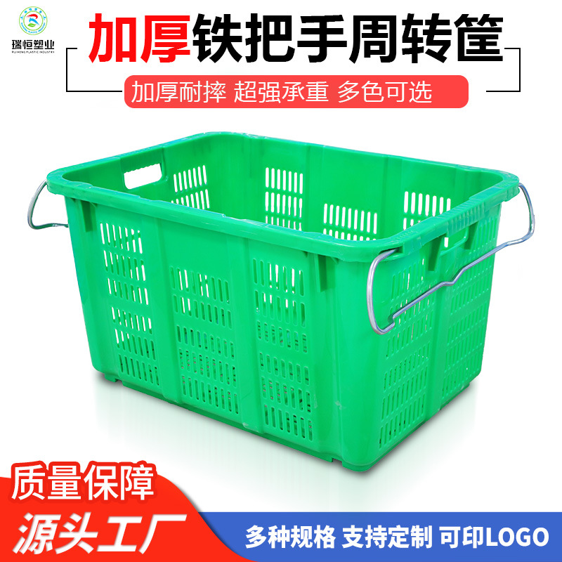 鉄ハンドル付き人気のプラスチックバスケット、野菜と果物の食品グレードの鉄耳付き厚みのある収納ボックス、マンゴーターンオーバーボックス