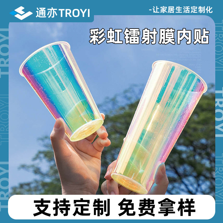 国境を越えた直接供給使い捨てミルクティーカップレインボーレーザーフィルムインナーステッカー90口径厚みのあるインターネット有名人のカラー射出成形カップ