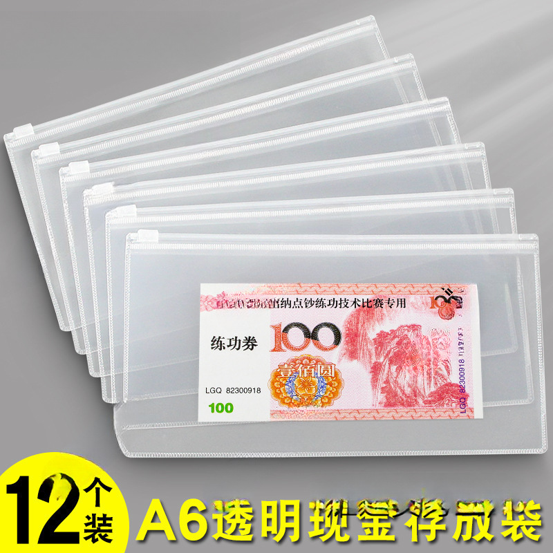 A6銭袋透明万元現金保管袋シールファスナーにお金を入れて紙幣を入れて預金して百元札を置く