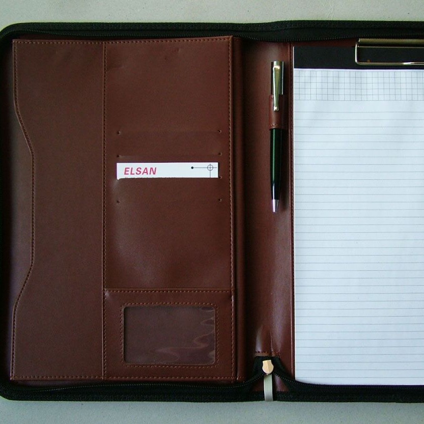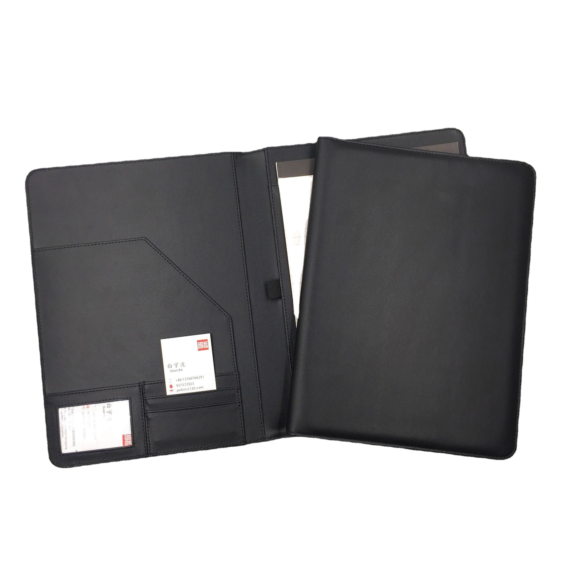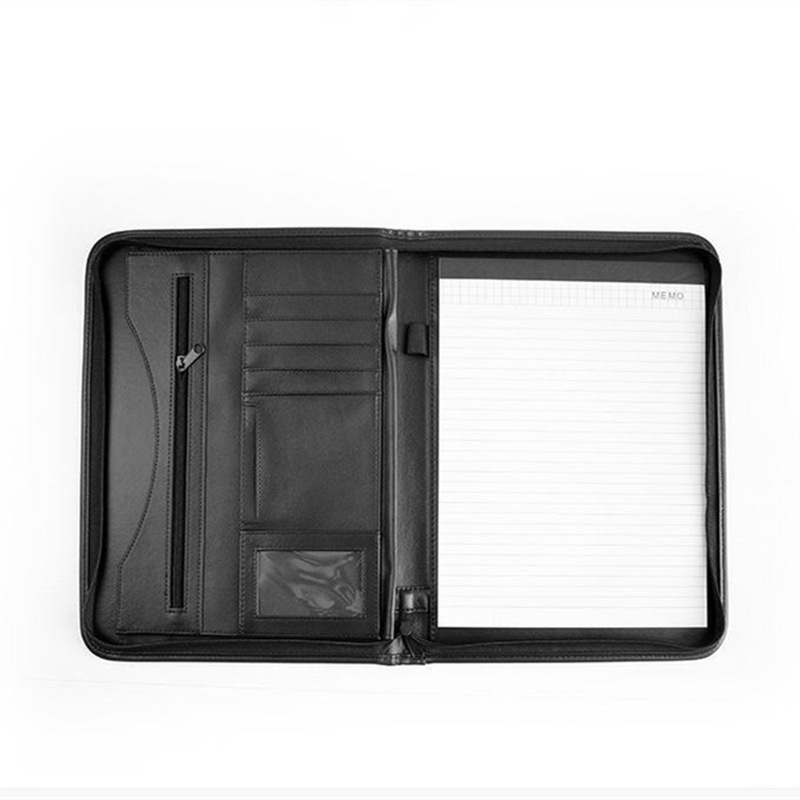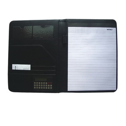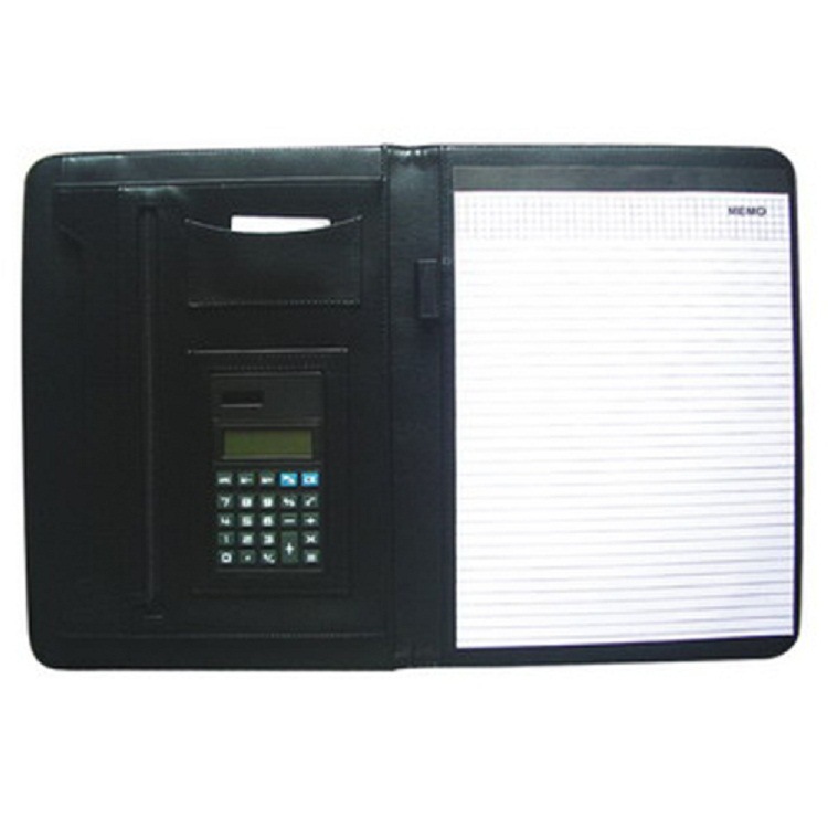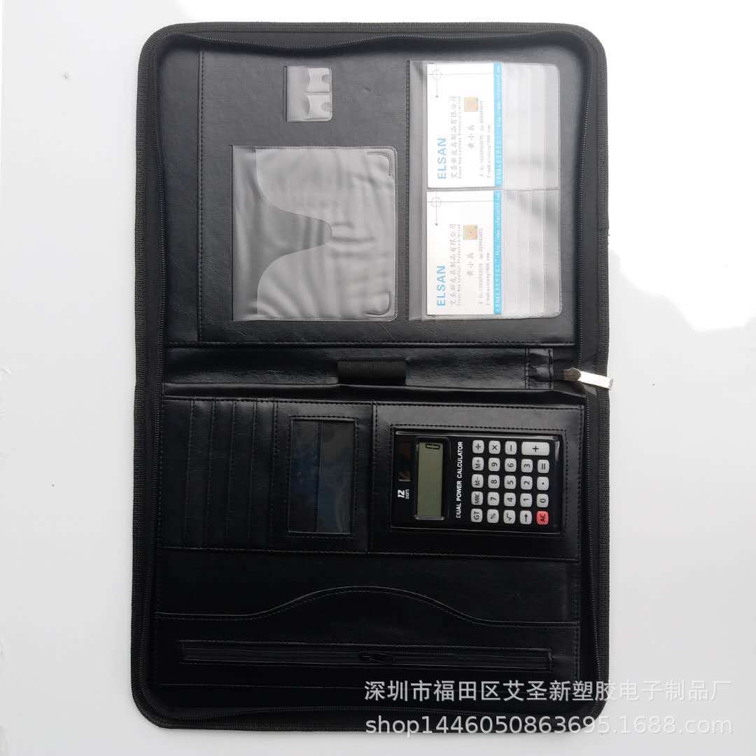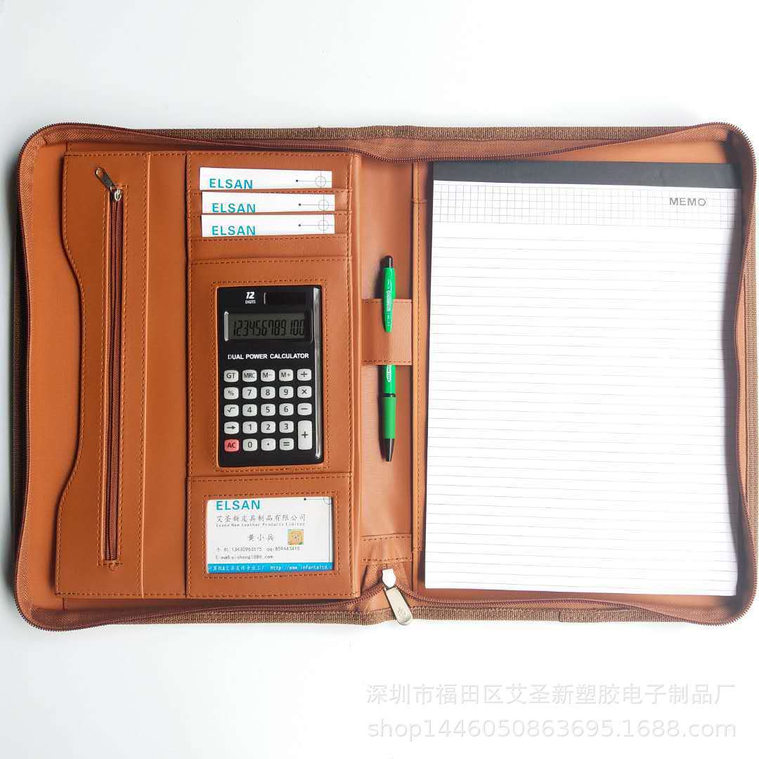メーカーのビジネス革製マネージャーは電卓、a4ジッパーバッグ、本カバーを持っている