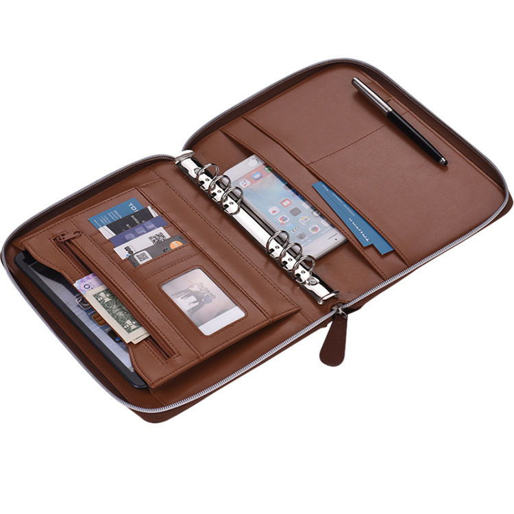 A4多機能メモファイル革表面ビジネスマネージャークリップ多機能ジッパーマネージャークリップ6穴バインダークリップ