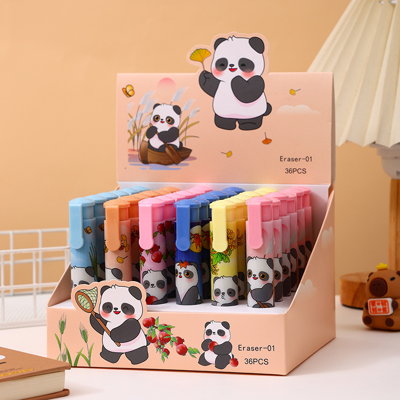 新商品のパンダは消しゴムを押して、小学生は消しゴムの子供のアイデアの文房具を拭きます。