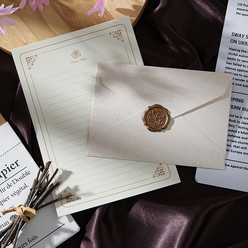 麻布紋封筒便箋セット復古風ラブレター中国風招待状金薔薇便箋国境を越えた火漆封筒