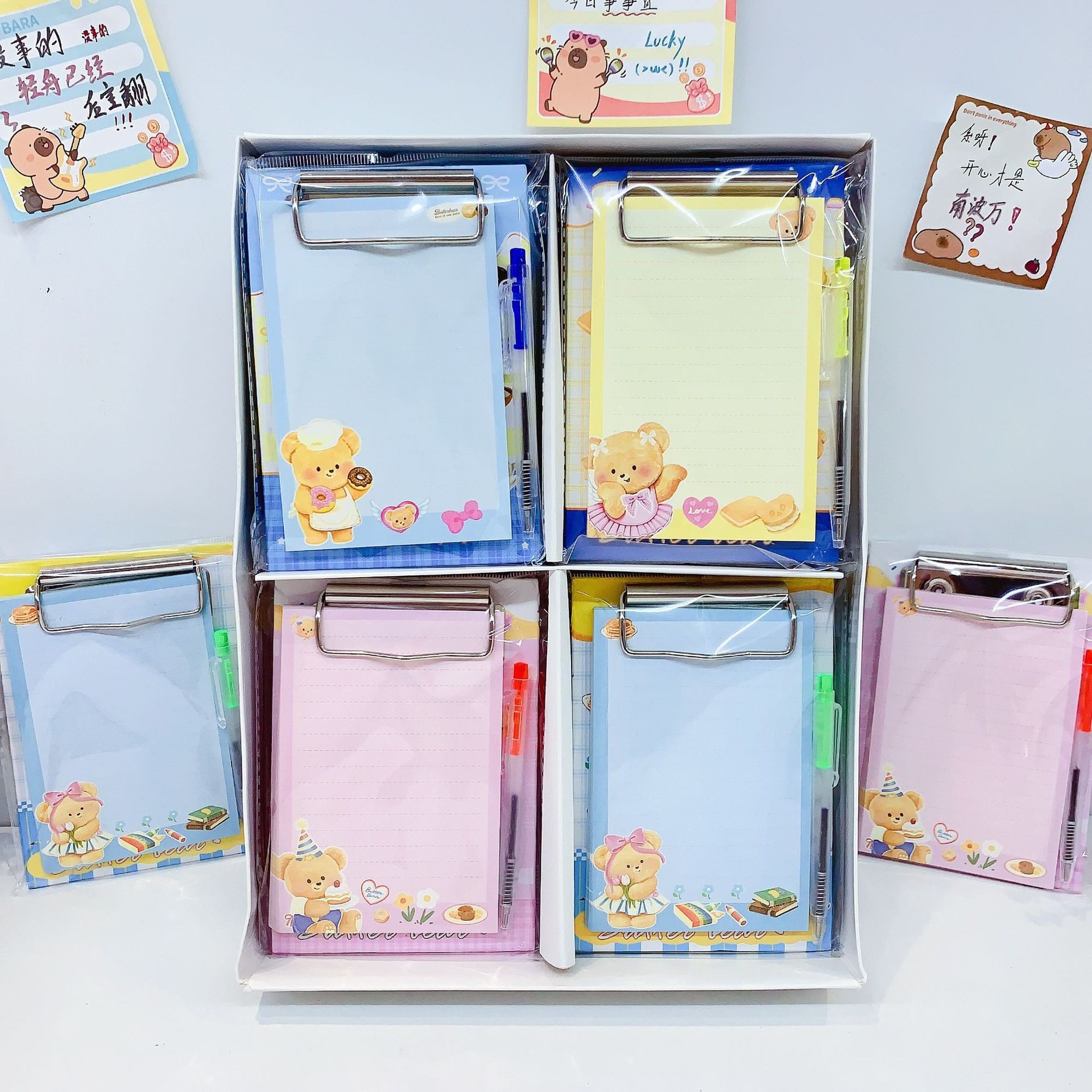 かわいいハッピーベアのクリップ付きメモ帳セット、ペンとカラーページ付き、かわいいメッセージメモ帳、携帯用ノート