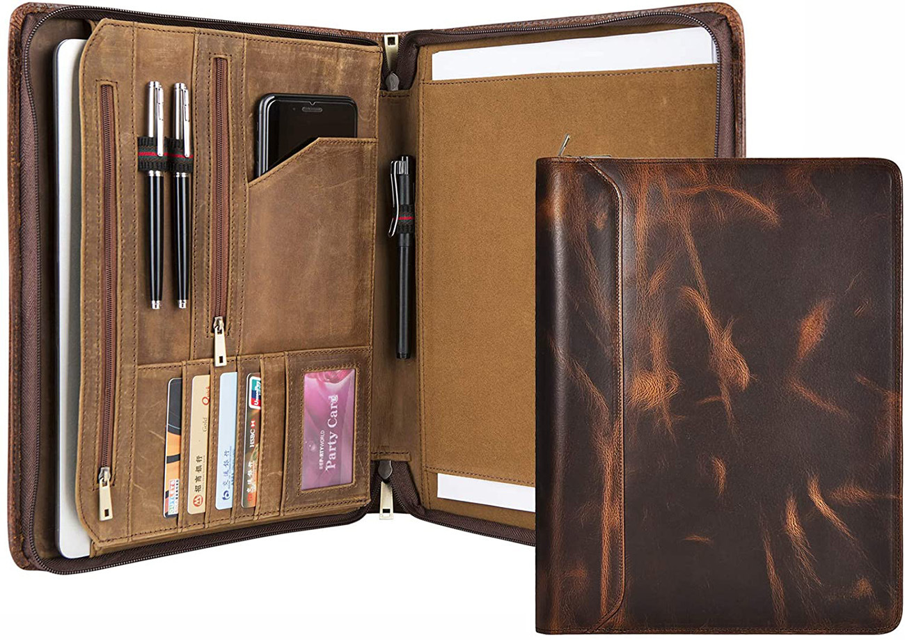 レトロ本革レザーpadfolioブリーフケースジッパービジネス収納バッグフォルダー色塗り狂馬皮