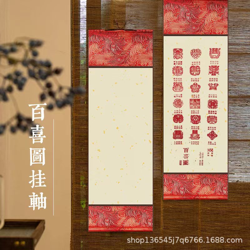 空白の宣紙の掛け軸は古の半生の熟の百喜図の捺印の巻物の高級な宋錦鳳尾の布の軸の赤い綾の布をまねます。