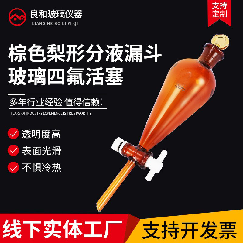 茶色ガラステフロンピストン梨形分液漏斗50ml 60ml 100ml 125ml 250ml 500ml