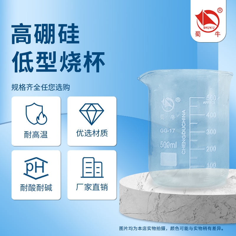 メーカー卸売蜀ガラス蜀牛ビーカー低型ビーカー高ホウ素シリコン耐高温ビーカー250ml 500ml 1000ml