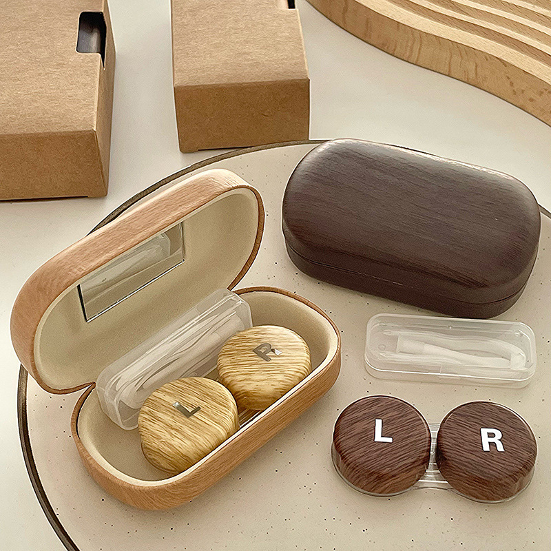 美瞳ケース革模造木目コンタクトレンズ付帯ケースミラー付き防漏部品独立収納ケアケース