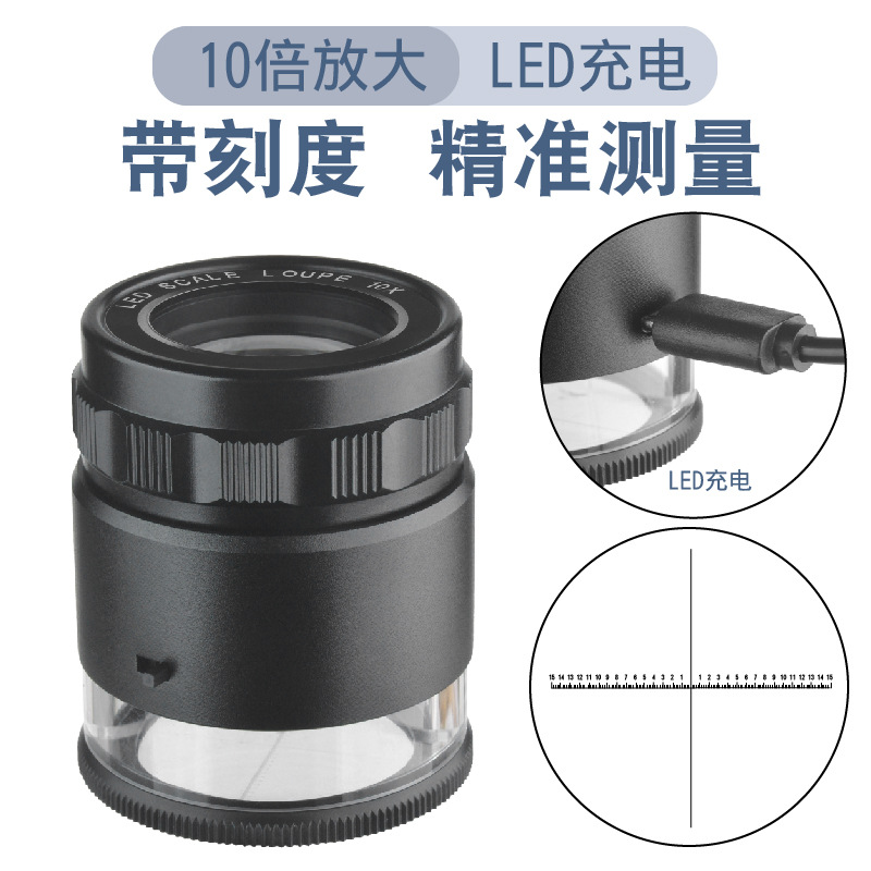 10倍全金属円筒式測定スケールusb充電タイプ光学ルーペ6個ledランプセット