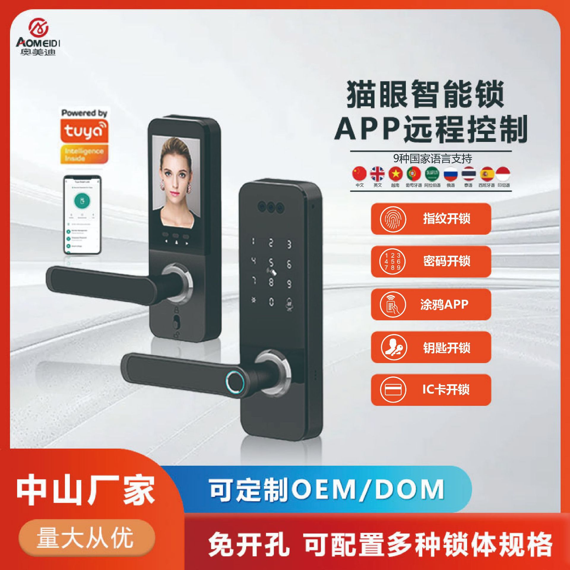 3D顔認識、指紋パスワード監視インターホン機能、指紋ロック解除を備えた家庭用全自動スマート電子錠