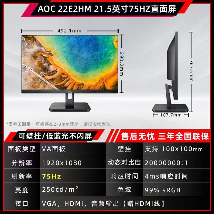AOC 22e2hmコンピュータディスプレイ21.5インチVA広視野角HDMI VGAクイックスタンド壁掛け可能