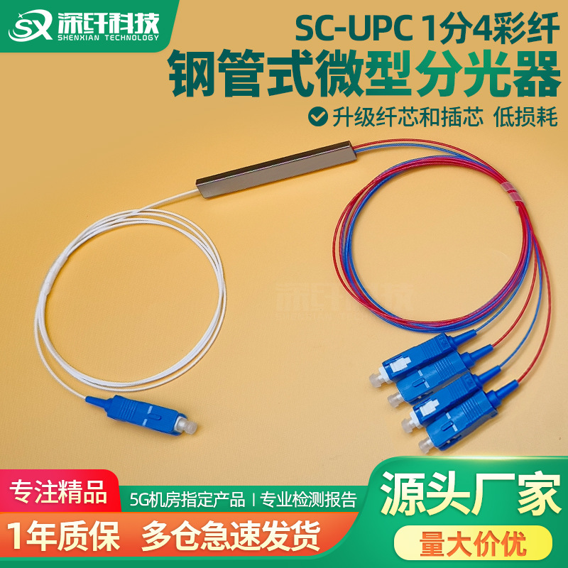カラーファイバーPLCマイクロスプリッター1分4均等分配SC/UPC-0.9-SM鋼管型スプリッター1分4通信
