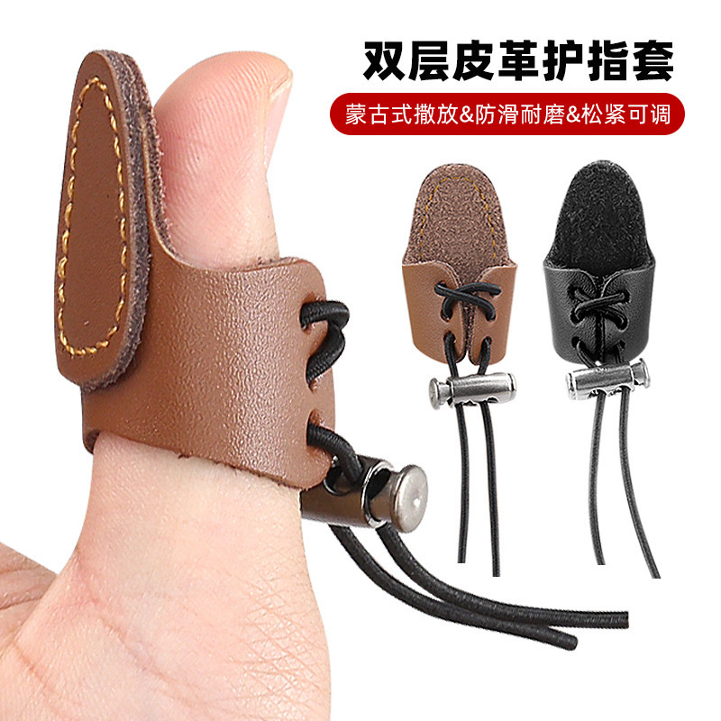 弓と矢の保護二層牛革フィンガーリングモンゴルスタイルの厚みのあるフィンガーリングシングル保護弾性調整可能な矢滑り止めフィンガー