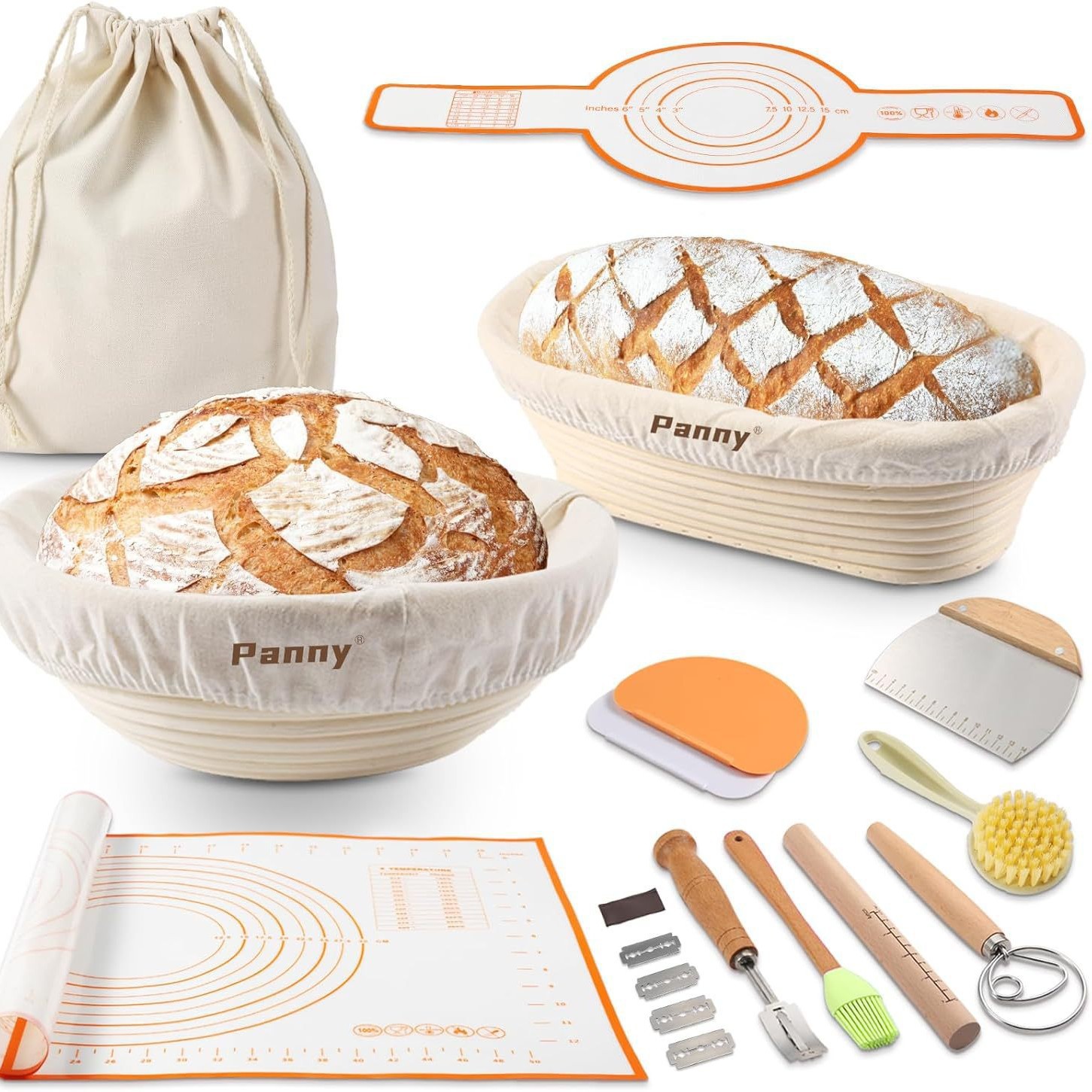 アマゾン19点セット 籐製発酵かご パン袋 生地切りナイフ 伸ばし棒 伸ばしマット 発酵かごセット