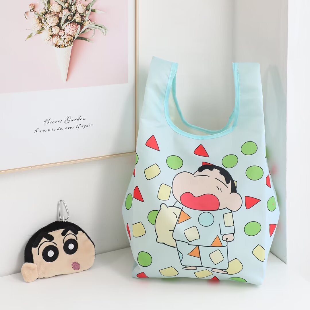 クレヨンしんちゃん携帯スーパーのレジ袋の収納袋を持って、片手で肩を持って、大容量で折りたたみ可能な小銭入れのストラップを持っています。