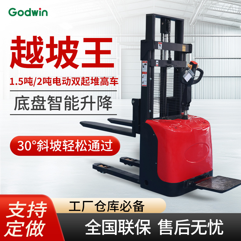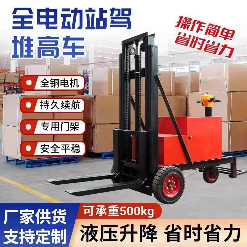 駅運転式油圧電動スタッカ高架倉庫作業場パレットフォークリフト荷重1t2t搬送車