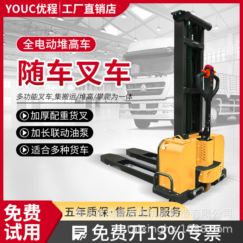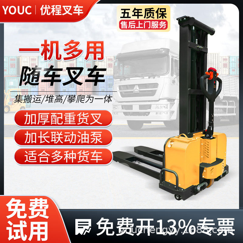 全電動車両搭載フォークリフト積み下ろしポータブル1T小型全自動油圧リフティングフォークリフトスタッカートラック