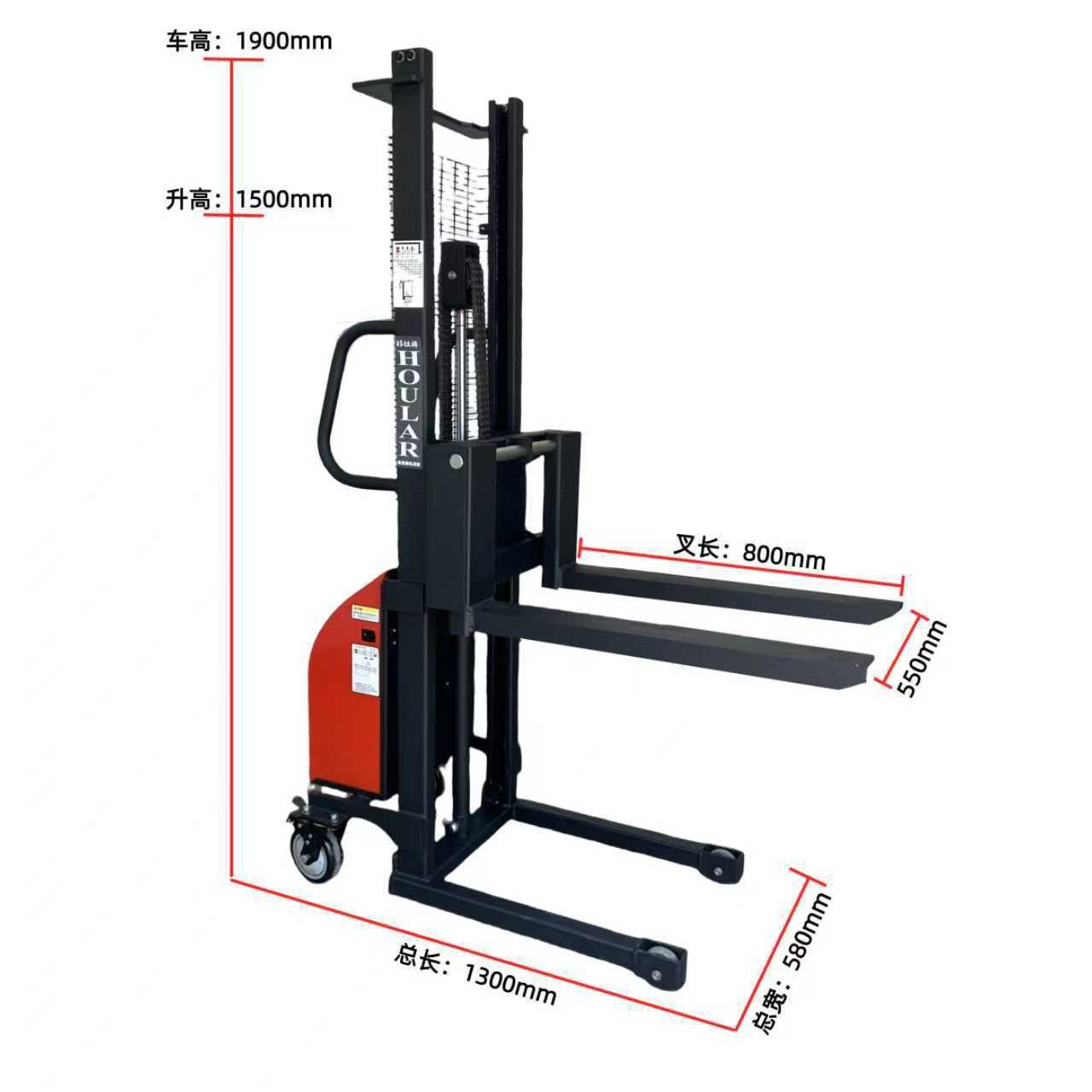 ウォーキング半電動スタッカートラック 1.5 トンリフティングトラック手動油圧パレット小型電動フォークリフト