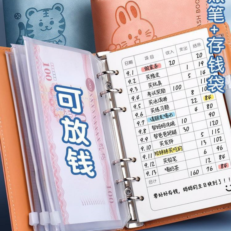 子供向けのお金管理バッグ、家計簿、小遣い帳、メモ帳、お金のためのジッパー、子供が手でお金を置くことができます。