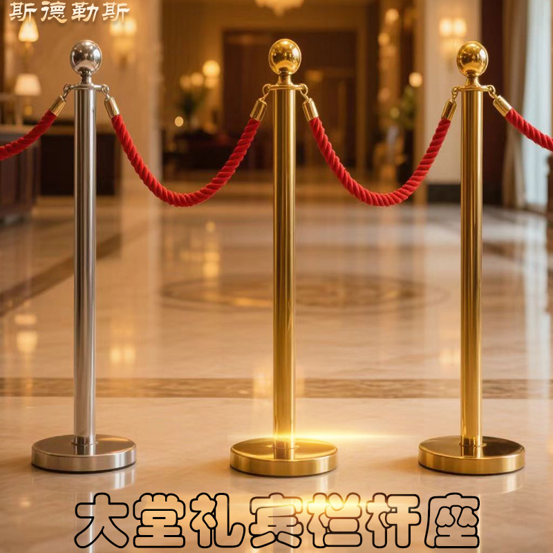U型ステンレス製の礼賓柵にロープを掛けてホテルのロビー活動一メートル線銀行の円球手すり座の礼賓柱