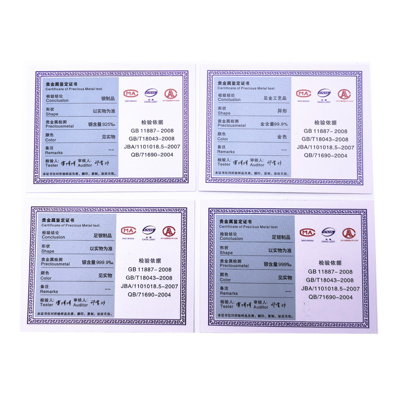 ジュエリーアクセサリー貴金属検査鑑定証明書925銀足銀足金工芸品印刷合格証