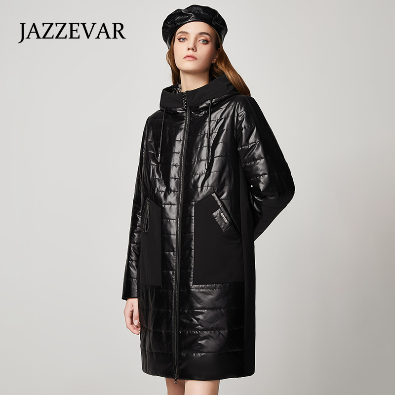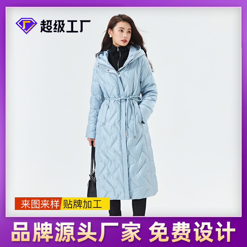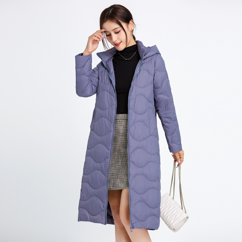 越境秋冬の軽薄な白鴨の羽毛ジャケットの女性の中の長いタイプの斜めのポケットは帽子をかぶって膝を越えて服を修理します。